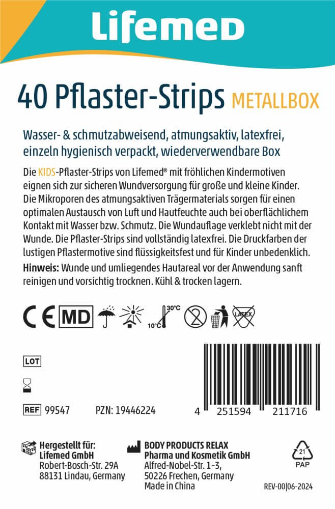 Lifemed Kinder Pflaster-Strips 6 x 1,7 cm | 40 Stück in Metalldose | hautfreundlich, wasserabweisend & atmungsaktiv