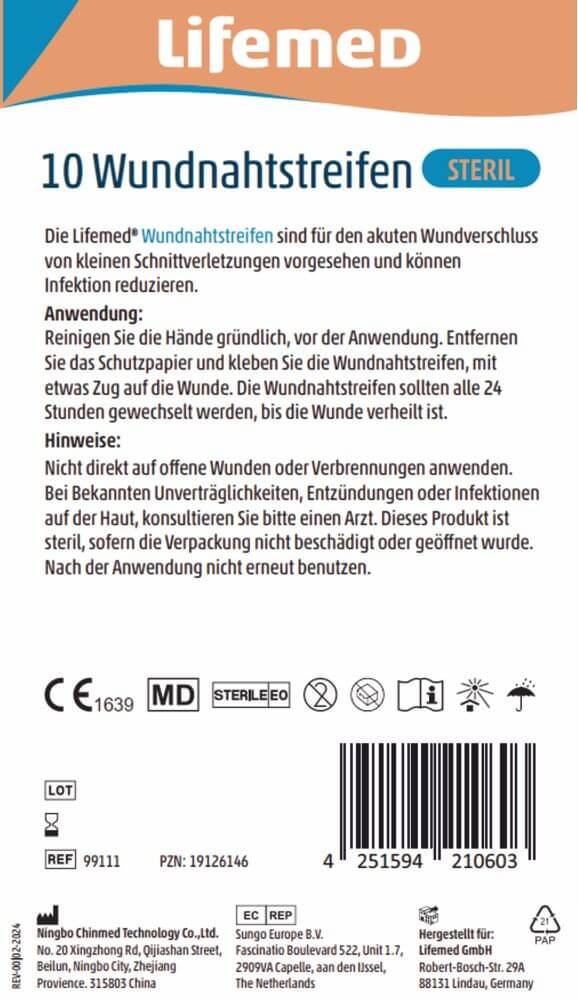Die Lifemed Wundnahtstreifen sind für den akuten Wundverschluss kleiner Schnittverletzungen entwickelt. Die hypoallergenen, steril verpackten Streifen sind atmungsaktiv, hautfreundlich und lassen sich individuell zuschneiden. Sie stabilisieren die Wundränder, unterstützen eine saubere Adaptation und können so das Infektionsrisiko reduzieren.